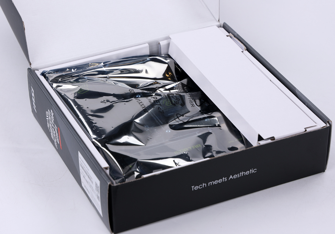 直接拆箱,主板本體有防靜電袋包裹,WIFI天線被單獨收納在主板上方的白色紙盒中。