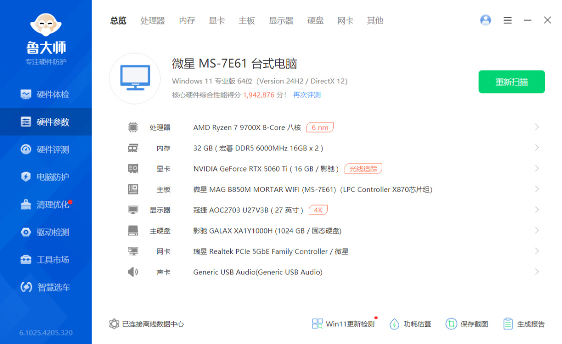 測試主機配置單:AMD R7-9700X處理器、微星MAG B850M MORTAR WIFI主板、影馳RTX 5060Ti 魔刃MAX顯卡、宏碁掠奪者 Vesta II 炫光星艦 D5-6000MT/s 16G*2內存、星曜 7000Plus 1T M.2固態硬盤、先馬平頭哥 M2 MESH黑色機箱、影馳風靈600幻境性能版風冷散熱器、先馬平頭哥E800 650W白牌非模組電源、影馳夢境Pro 黑色散熱風扇*5...