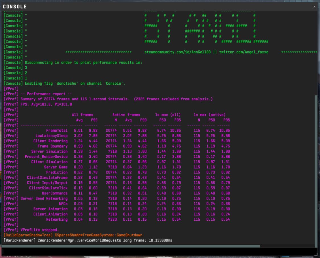 《CS2》遊戲基準測試,將遊戲畫質預設設爲非常高,2K分辨率下,遊戲平均幀數爲181.6 FPS,1%LOW幀爲101.8 FPS。1080P分辨率下,遊戲平均幀數爲264.1 FPS,1%LOW幀爲140.8 FPS。