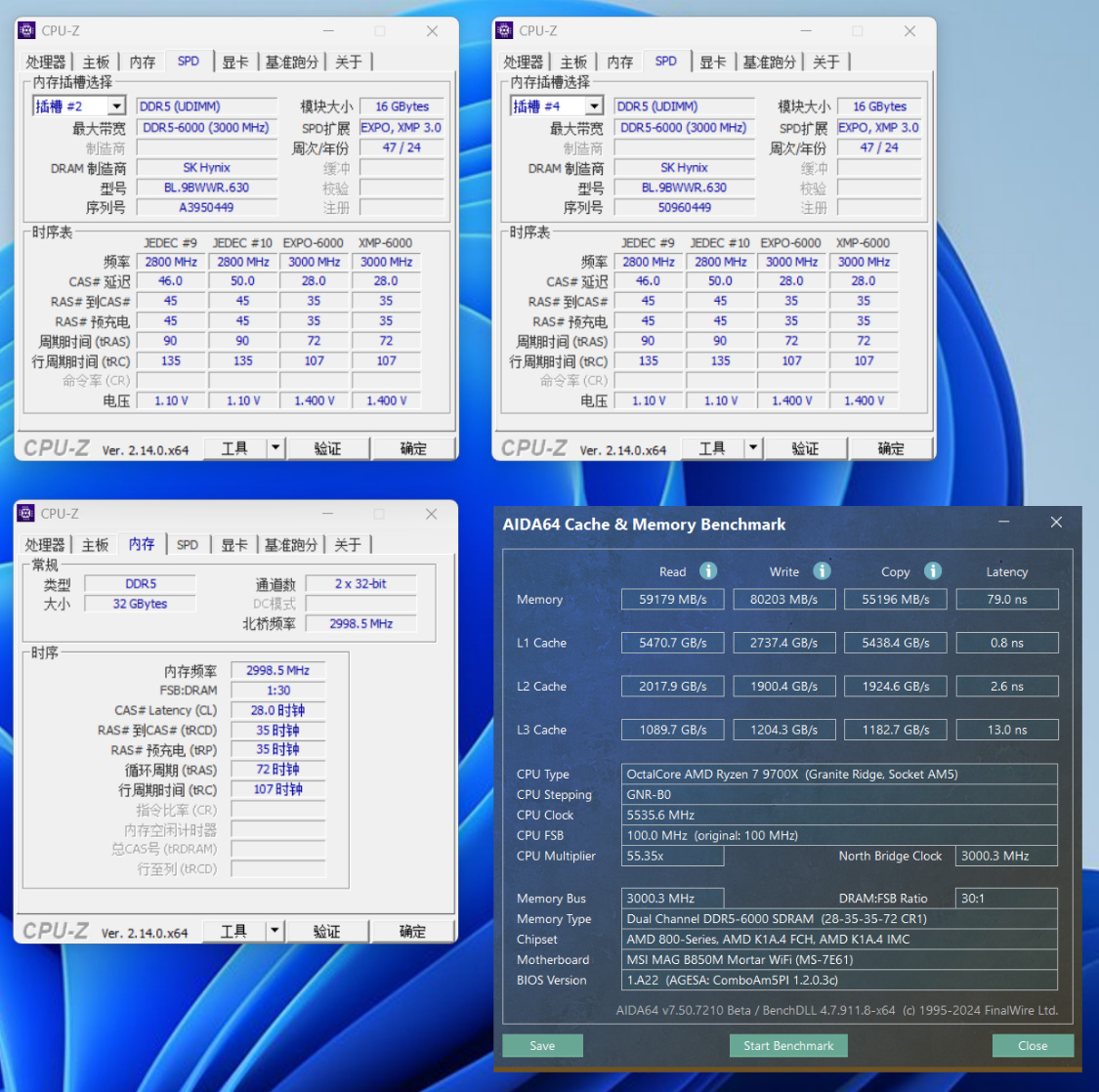 開啓內存EXPO,讀取速度爲59179 MB/s,寫入速度爲80203 MB/s,複製速度爲55196 MB/s,延時爲79 ns;