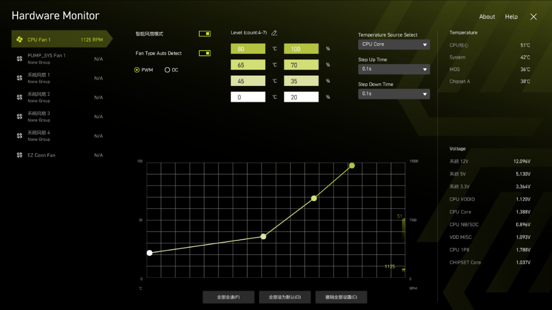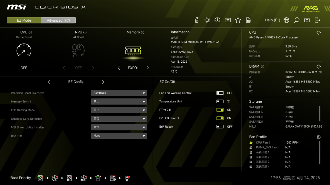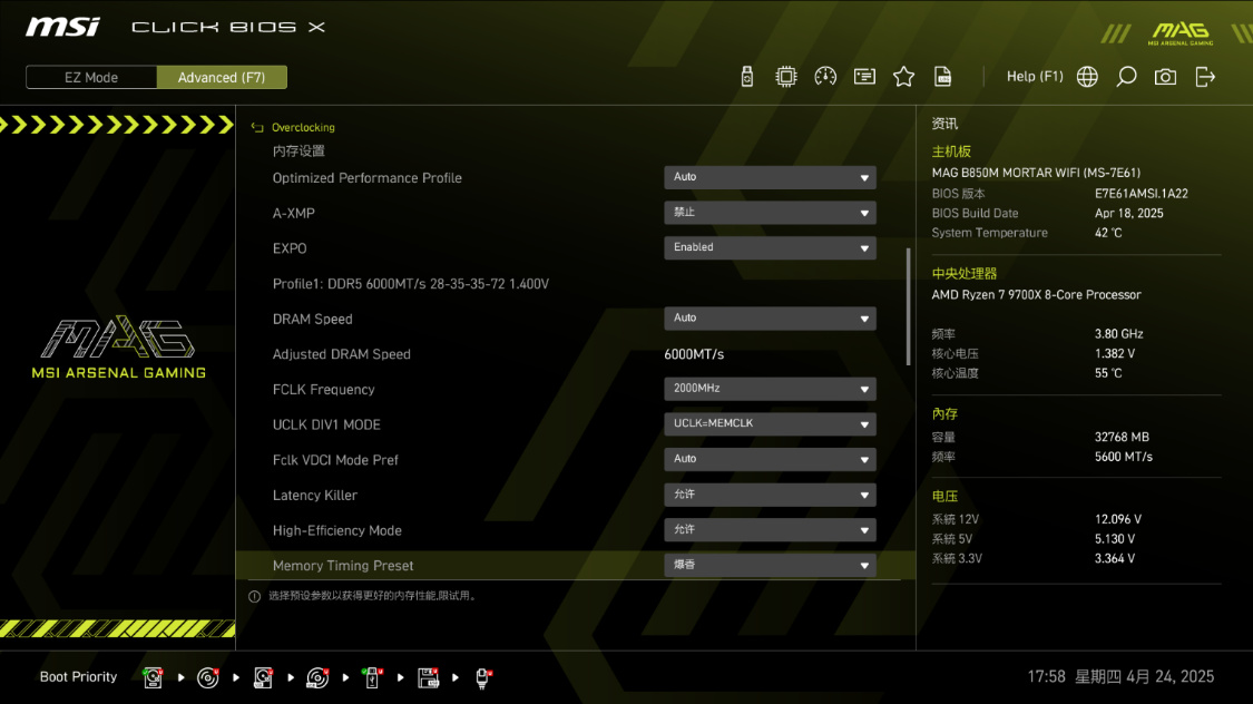 微星主板BIOS已經全新升級,各個系列在UI上也做了區隔。MAG系列的這熒光綠配色,也相當搶眼。在簡易模式下,玩家就可以對主板的內存超頻、CPU BOOST、風扇轉速等大部分功能進行設置調整,大大降低了玩家折騰超頻的難度。同時,首次開機時,主板還會提示玩家選擇不同的CPU性能設置;