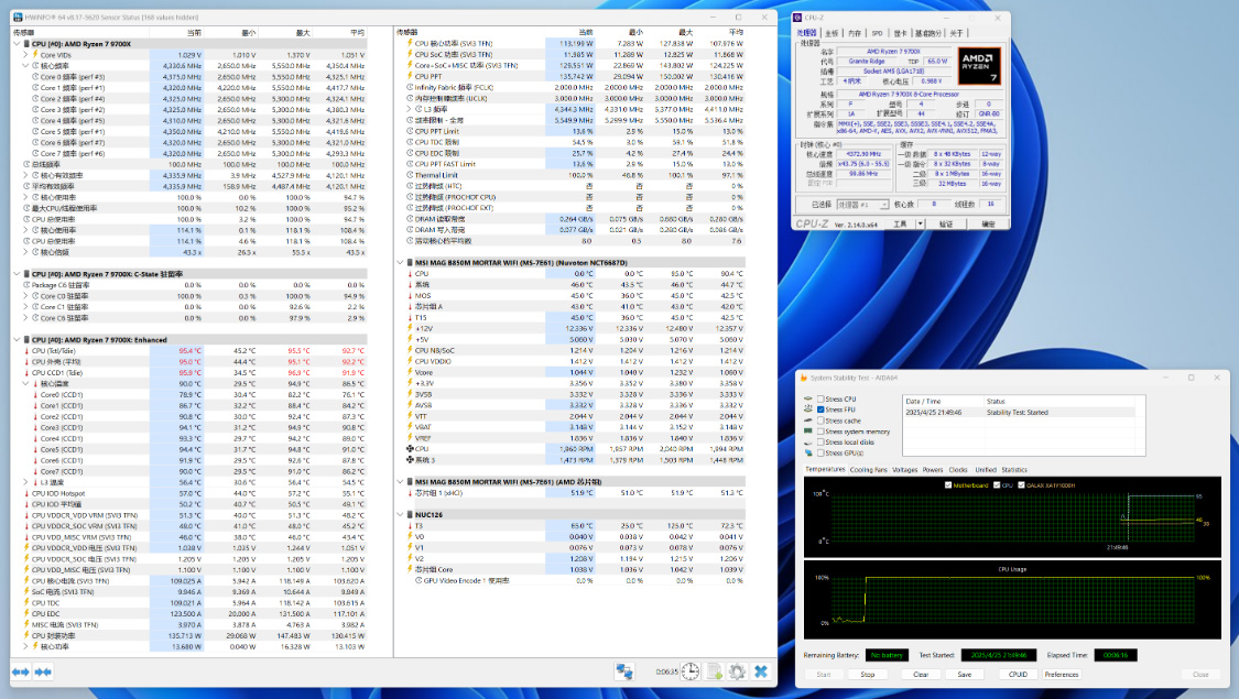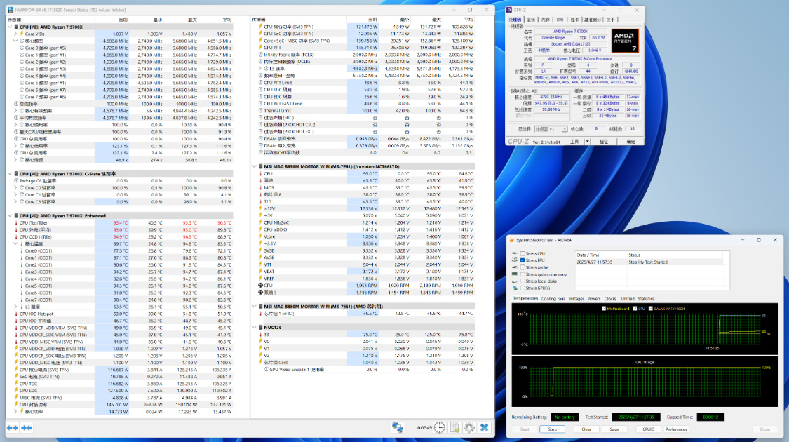 手動PBO,烤機測試,CPU實時頻率爲4.7GHz,CPU外殼溫度爲95°左右,CPU封裝功率爲150W左右;