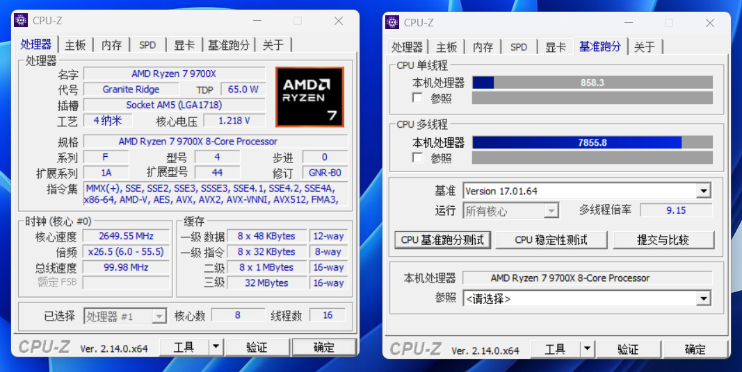 CPU-Z基準測試,CPU自動睿頻狀態下,單核得分858.3分,多核得分7855.8分;