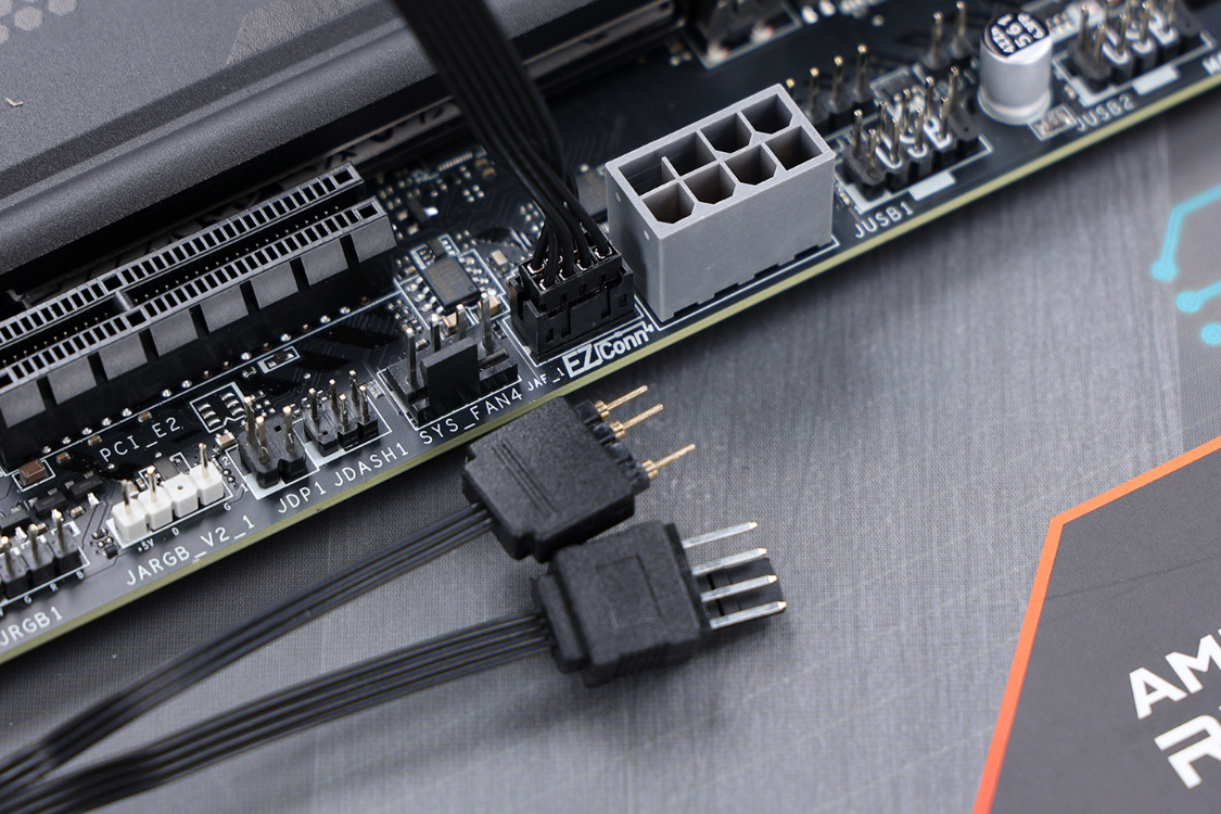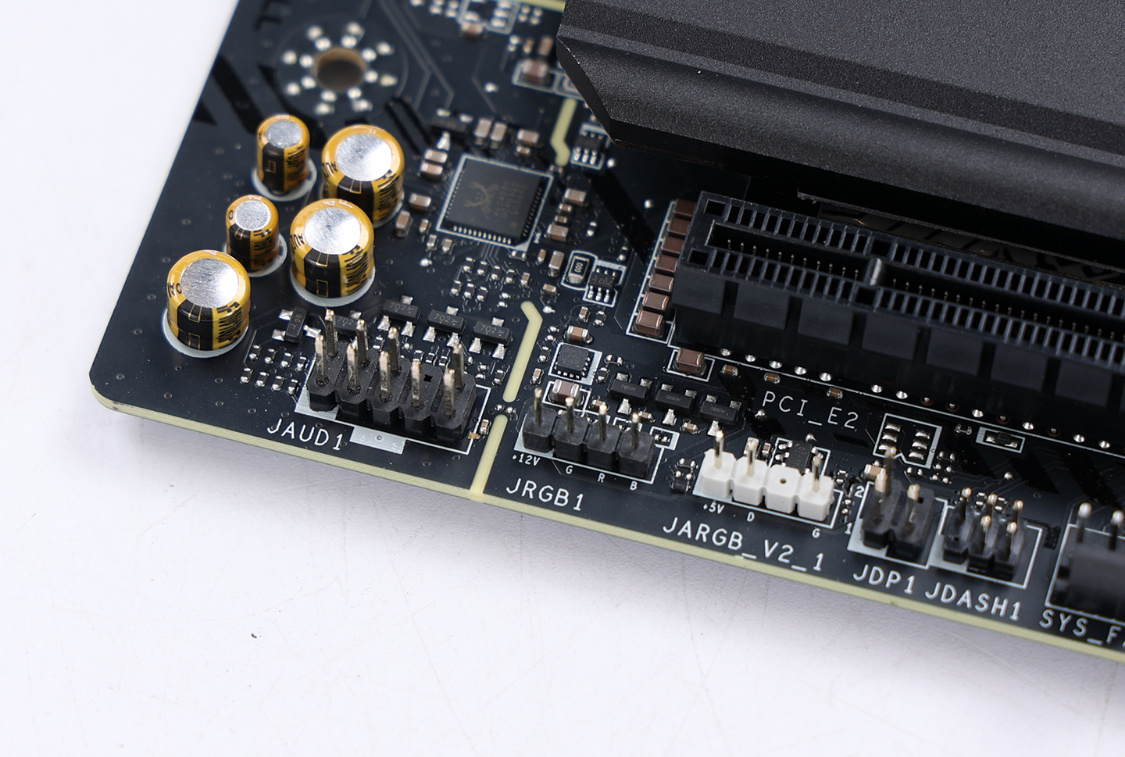 主板底部PCIe輔助供電接口的旁邊,還配備有微星獨創的EZ Conn JAF_1拓展接口,通過配件中的EZ Conn拓展線,可以將EZ Conn接口拓展出PWM風扇接口*1以及5v3Pin ARGB燈效接口*1,既保證了主板硬件拓展和數據傳輸能力,還方便玩家理線。