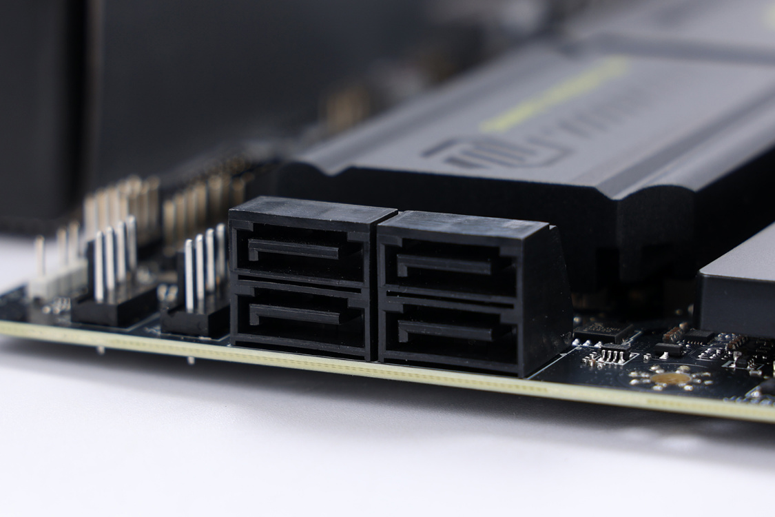 4個SATA硬盤接口則位於主板右下角的開機跳線接口區域,所有接口均採用了90°轉置的設計,並支持SATA 3.0 6Gbps/s的傳輸速率。