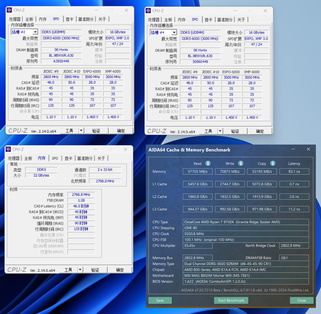 全默狀態,內存讀寫測試,讀取速度爲57705 MB/s,寫入速度爲70873 MB/s,複製速度爲53193 MB/s,延時爲93.1 ns;