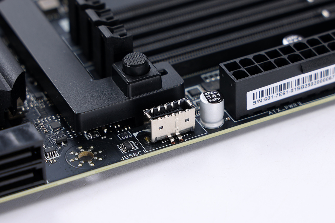 主板提供了3個M.2固態硬盤位和4個SATA硬盤接口。位於主板正面的2個M.2硬盤位採用了CPU直連設計,接口最高支持PCIe 5.0 x4的傳輸速率,第三個M.2硬盤位則位於主板背部靠下,基於芯片組傳輸數據,支持PCIe 4.0 x2的傳輸速率。同時,正面的的2個M.2硬盤位均配備了採用快拆設計的金屬馬甲,厚實的雙面馬甲設計,可以給硬盤提供涼爽的運行環境,保證硬盤可以穩定高效的運行。