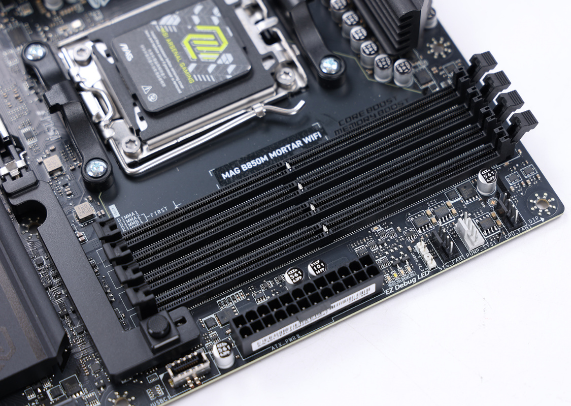 主板提供了4條採用單邊卡扣設計的DDR5 內存插槽,最大支持256G的內存容量,最高支持8200+ MT/s的內存OC頻率,主板支持AMD POR Speed和JEDEC Speed兩種內存頻率模式、支持AMD EXPO內存超頻技術、支持雙通道內存模式、支持非ECC內存和無緩衝內存,並且還支持最新的CUDIMM規格的內存。插槽旁邊還提供了4顆EZ Debug LED指示燈,以方便玩家可以在電腦出現故障時,可以快速排障。