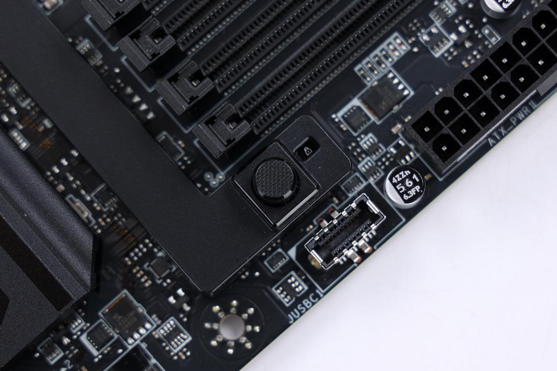 主板供電MOS的上方覆蓋着兩塊體積巨大的黑色VRM散熱裝甲,裝甲側面採用了大量開槽式設計,可以有效提高裝甲與空氣之間的接觸面積,提高裝甲的的散熱表現,搭配上隱藏在主板供電MOS與散熱裝甲之間的大面積7W/mK高性能導熱墊,也保證了主板散熱模塊在供電模組處於高負載的狀態下,也能維持十分高效的散熱表現,從而保證主板可以長時穩定高效的運行。