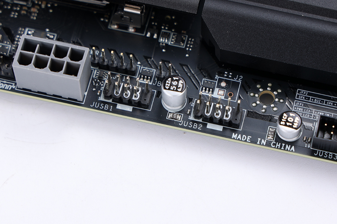 前置USB接口方面,主板在24Pin主板供電接口旁邊提供了Type-C插槽*1,USB 3.0插針接口*1和2個USB 2.0插針接口則位於主板底邊中部,所有接口最多可接駁出USB 2.0*4、USB-A 5Gbps*2、Type-C 10Gbps*1 數據接口。