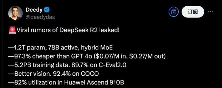 @deedydas的博主透露了深度求索即將推出的新一代AI大模型DeepSeek-R2的相關參數信息。