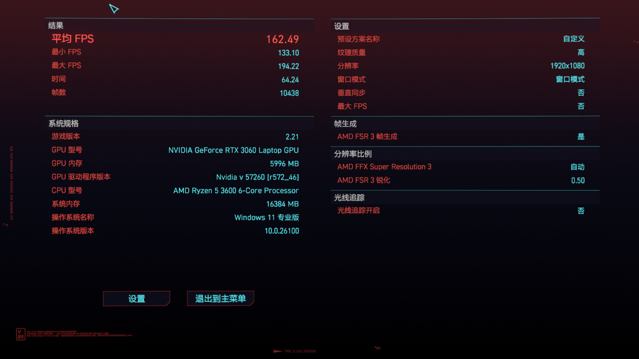 ● 畫質選擇1080P分辨率+默認高特效+開啓FSR幀生成+不開啓光追,平均幀數爲162.49FPS。