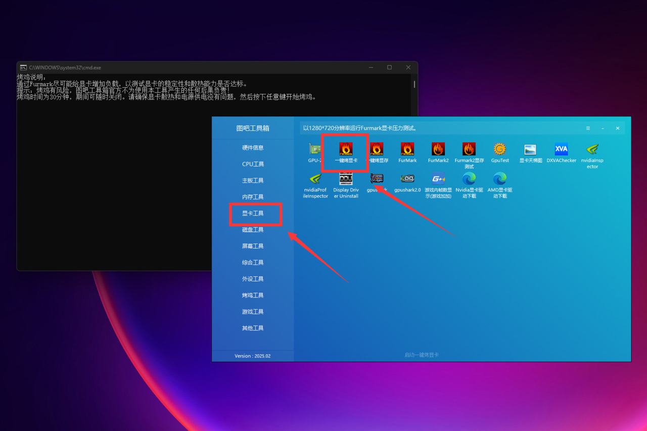 點擊圖吧工具箱顯卡工具中的一鍵烤顯卡,出現左側的黑框後,按任意鍵開始自動壓力測試。