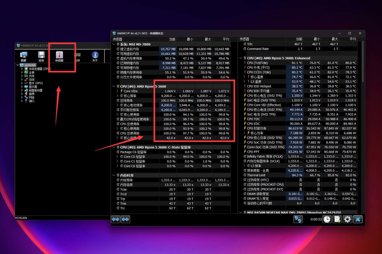 接着點擊傳感器,圈出來的地方會顯示CPU頻率,在R23進行測試期間,CPU應該一直保持理論最大頻率,比如這裏就是4.2GHz,和3600的官方數據一致。
