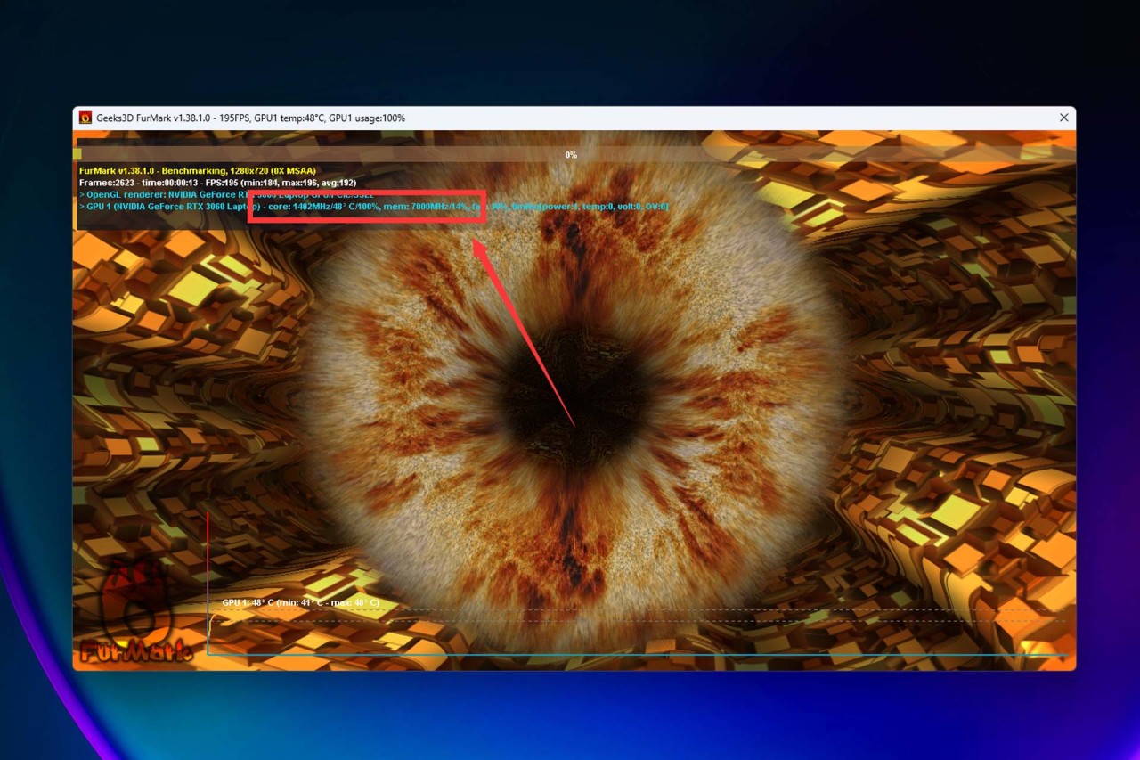 開啓檢測後,上面是進度條,跑完表示顯卡沒啥問題,下面圈出來的是顯卡核心頻率+顯存頻率,應該穩定保持且與理論最大值一致。