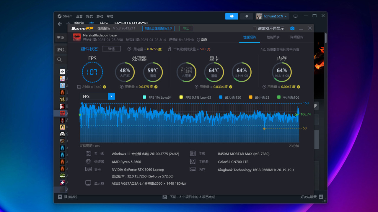 首先是要求配置較高的常規動作網遊,案例選擇永劫無間(DX12),測試結果如下圖所示: