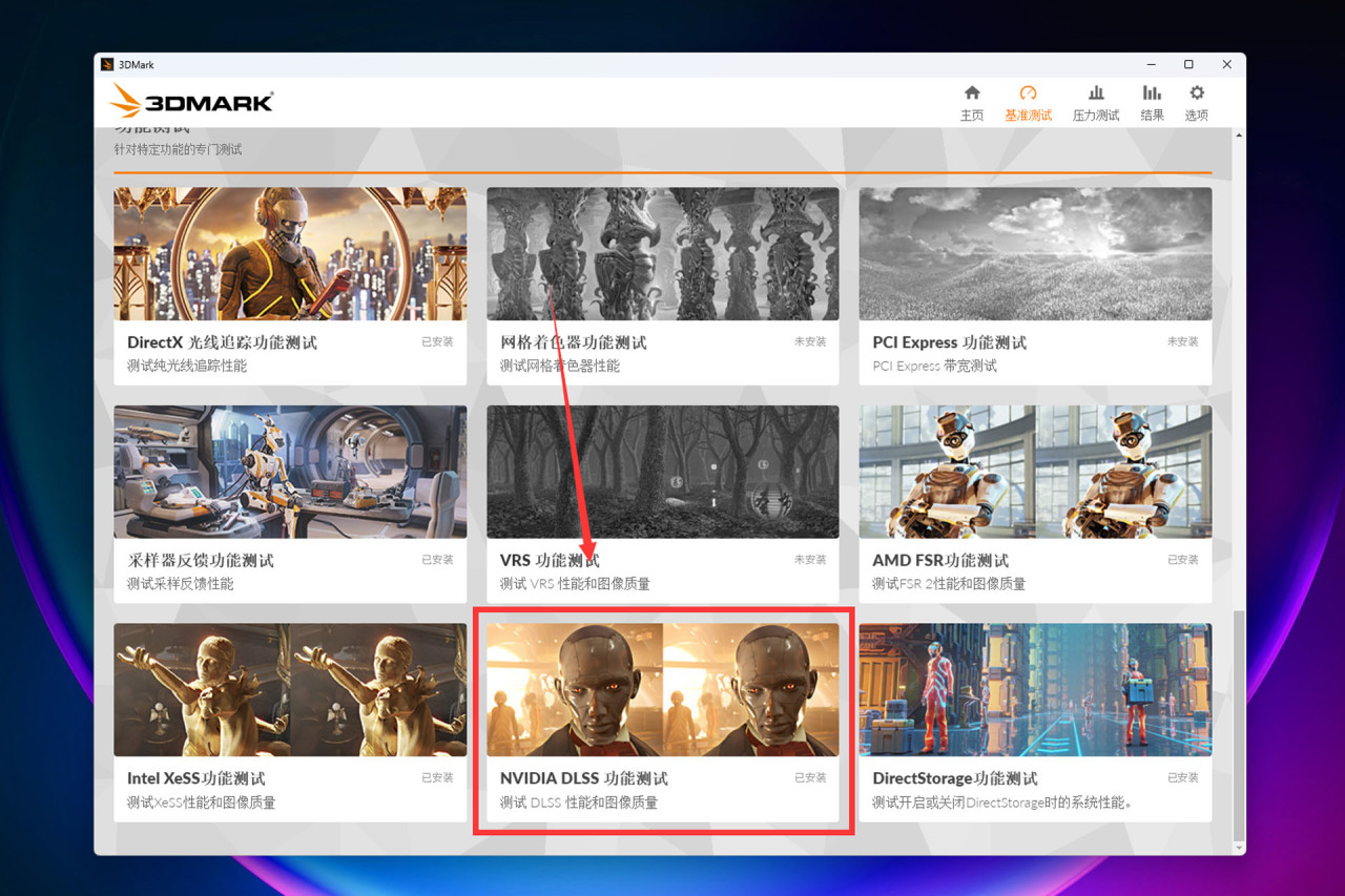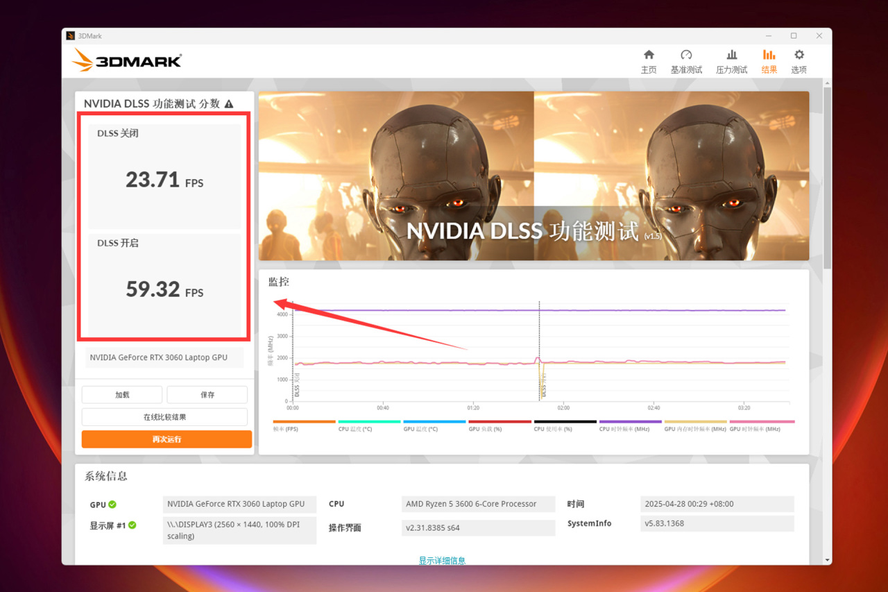 ● 我這裏用的是3DMark的DLSS模組,如下圖一樣,開啓DLSS後幀數有提升就是對的。