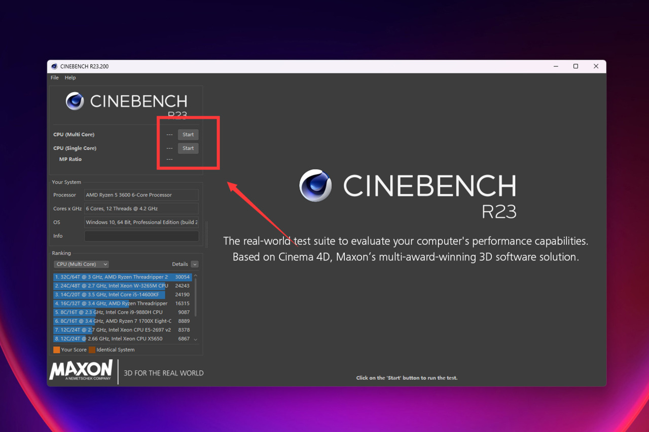 安裝完成後打開,點擊下圖圈出來的Start,開始進行單核+多核跑分測試,R23的壓力是給到CPU+內存,完整跑完不出錯不死機就說明這兩個硬件可以穩定運行。