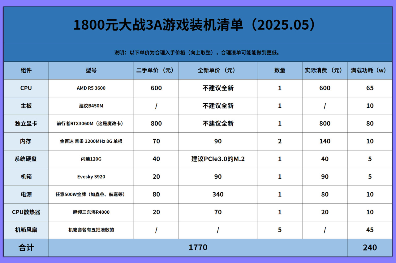 具體配置單如下所示,二手價格爲發文時的行情價(偏高),看成色多點少點正常,狂野男孩也可以選擇去掉機箱,價格能再低點。