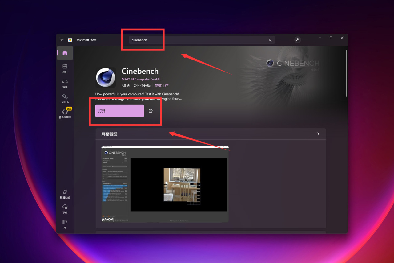 首先打開windows自帶的微軟商店,搜索Cinebench,搜索安裝,這也是很多評測跑分會用到的R23。