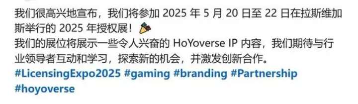 此外,有看到消息稱,來自米哈遊北美工作室的員工說,今年5月份在拉絲維加斯授權展中,會有令人興奮的米哈遊IP的內容,如果消息爲真,很有可能就是《崩壞:因緣精靈》或《星布穀地》其中之一。