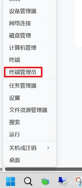 右键【开始菜单】按钮,点击【终端管理员】,然后输入以下代码,最后敲回车即可。