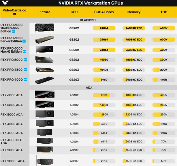 另外,NVIDIA三月中旬發佈了Blackwell架構的新一代RTX PRO專業顯卡,其中頂級型號RTX PRO 6000配備多達96GB顯存,比上代翻了一番,而且升級最新到GDDR7。