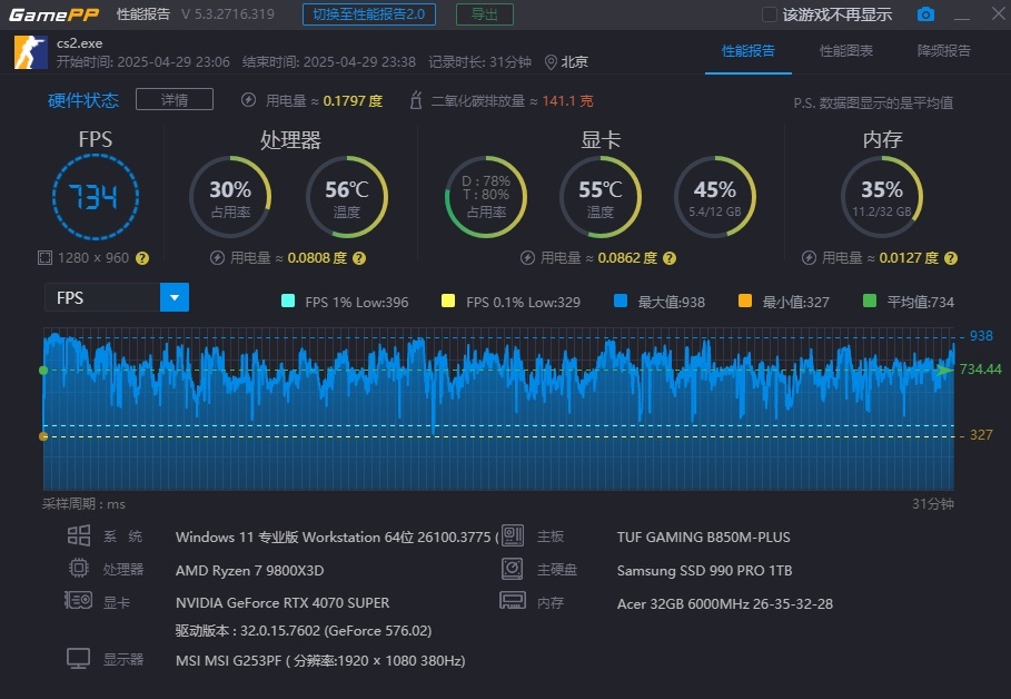 平均FPS:734 1%Low:396 0.1%Low:329 各硬件温度表现良好