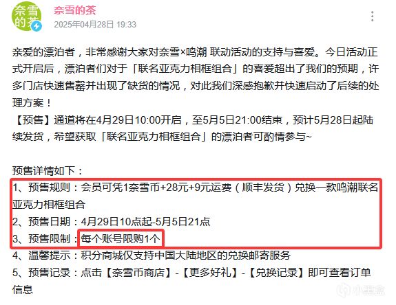 好在奈雪方面相當重視本次聯動,面對缺貨情況很快給出瞭解決方案,現在聯名亞克力相框改爲線上銷售,每個賬號限購一份,完美杜絕了黃牛問題,隔壁聯動的奶茶店還不快來學學。
