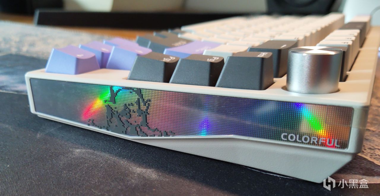 不过值得一提的是,七彩虹这次在键盘外观上还是比较用心的,比如侧边这个镜面设计,你正着看是镜面效果,侧着看就真的会有彩虹出现