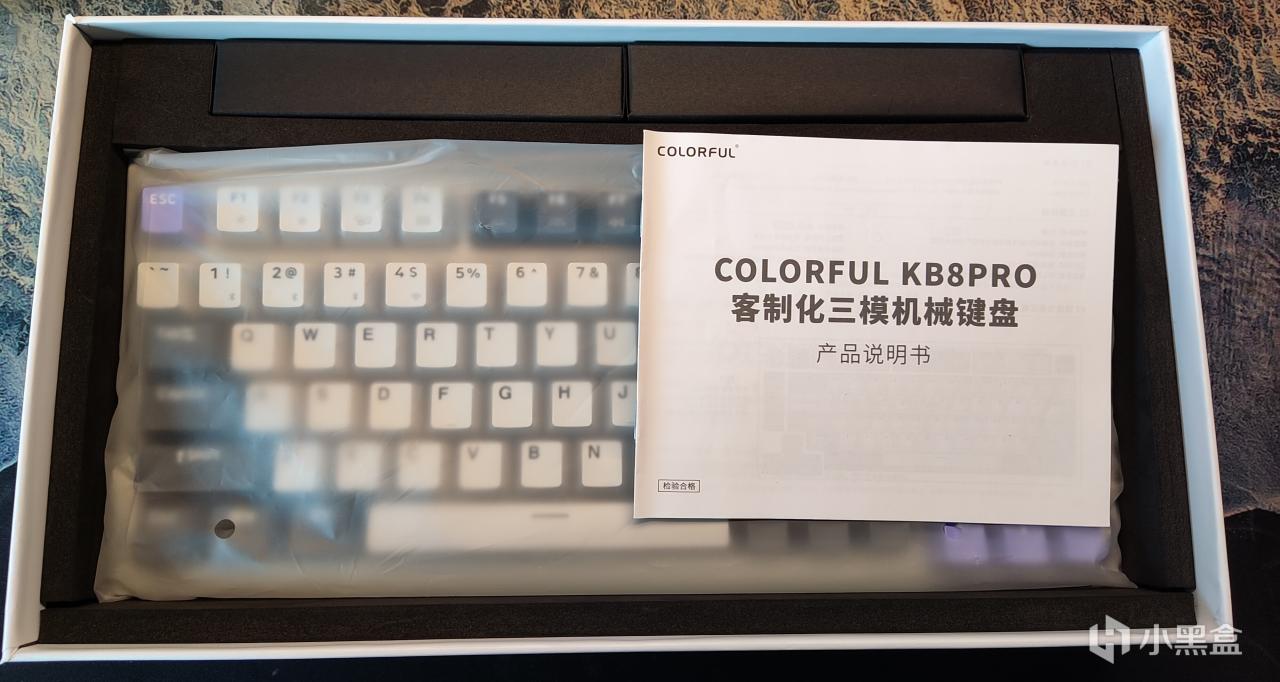打开盒子,里面第一层是黑色的海绵减震板。接下来就能看到配键盘和键盘本体啦