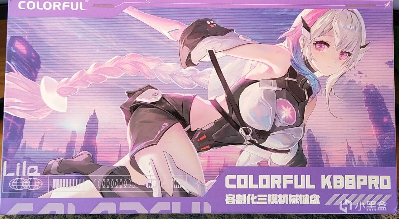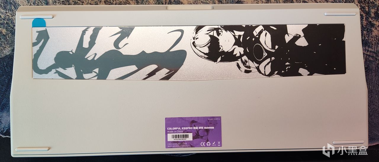 首先一拿到手,就感觉这个键盘特别沉,不愧是铝坨坨,连键盘带盒差不多四斤。包装上面有隐姬老婆的画像,侧面则是产品名牌。