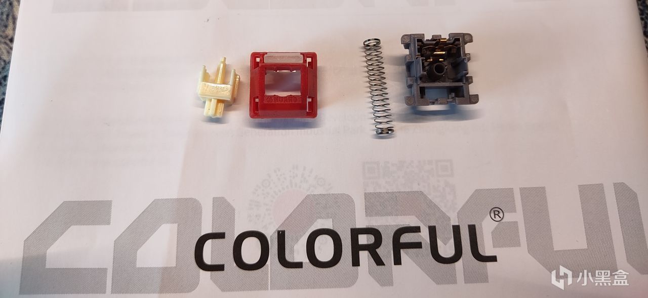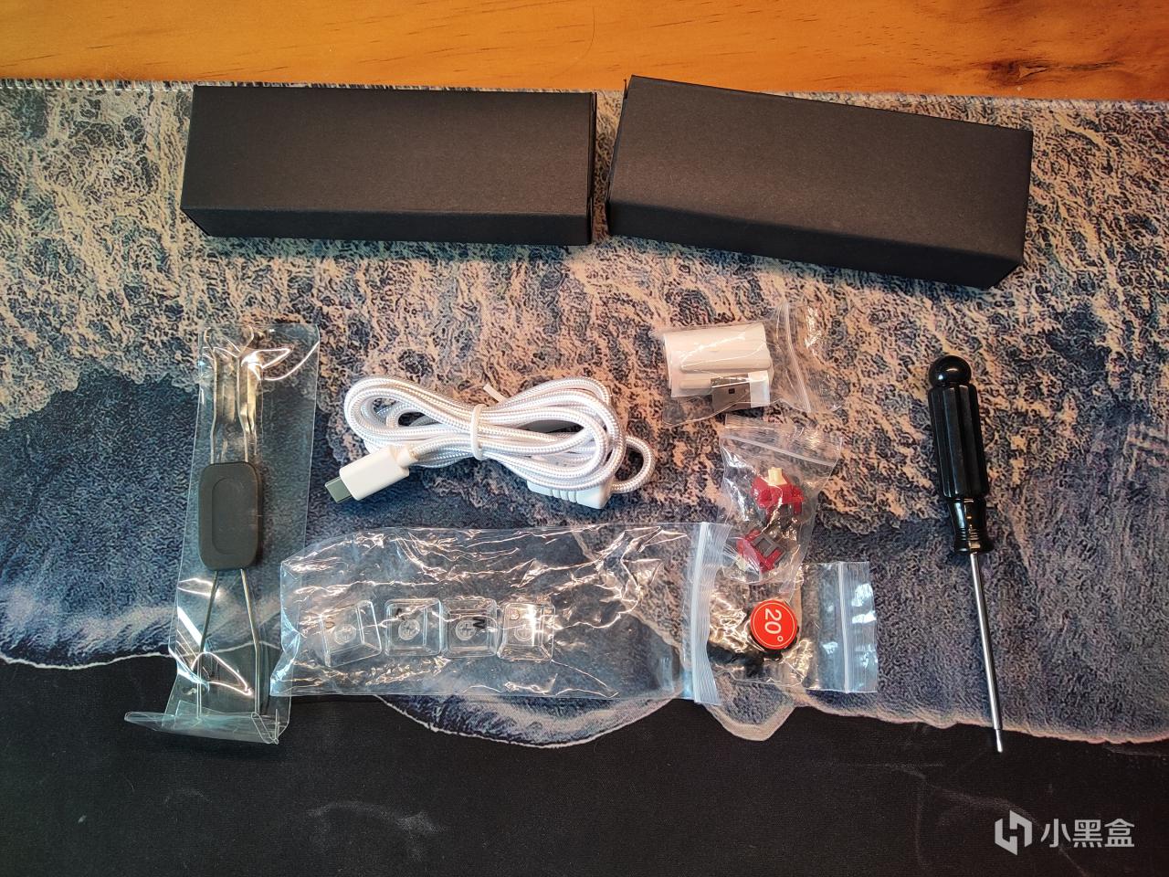 配件方面,七彩虹给的特别充足。分别有拆卸螺丝刀、补充键帽、补充轴体、补充硅胶粒、补充脚垫、拔轴器、数据线、无线接收器和转换器。作为七彩虹的高端键盘,这个配件包还是很不错的基本上会损耗的部件都给了补充装,很大方