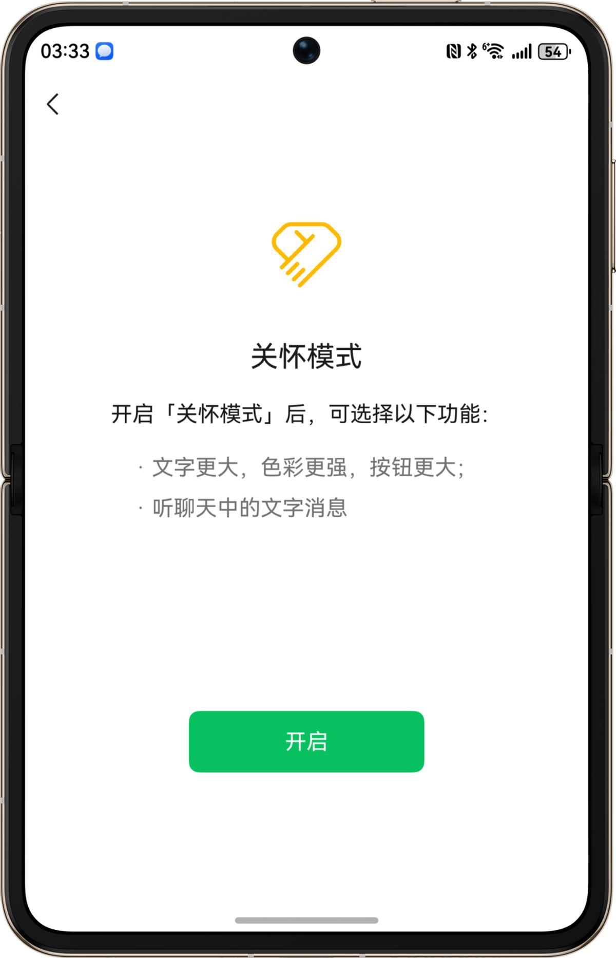 新增功能5:支持關懷模式,點擊“我”,然後點擊“設置”,可開啓關懷模式,關懷模式下文字更大,色彩更強,按鈕更大,還可以聽聊天中的文字消息,適合老人和特殊人羣。