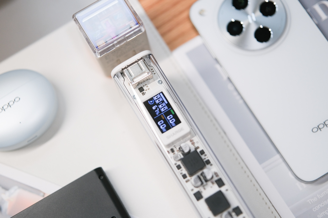 市面上99%的透明充電寶都在用綠色電路板,而銀翼Pro的純白PCB板宛如藝術品,連電容電阻的排布都經過美學設計;全機身找不到一條接縫,灰塵水漬根本無門可入,露營時摔進溪水裏撈起來擦乾照用;470g機身≈半罐可樂,航空鋁骨架卻讓握感沉穩紮實,工字龍骨架構甚至能扛住成年男子踩踏(實測!)。