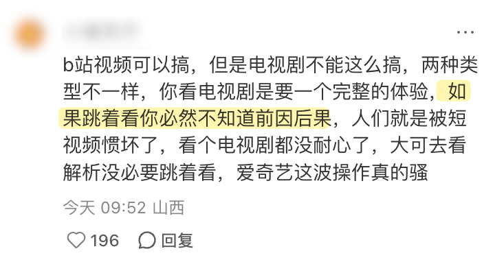 像差評君把這新聞分享給一個天天用愛奇藝的同事後,她說:這功能設計得好啊,愛奇藝上一堆劇,確實很需要跳過。