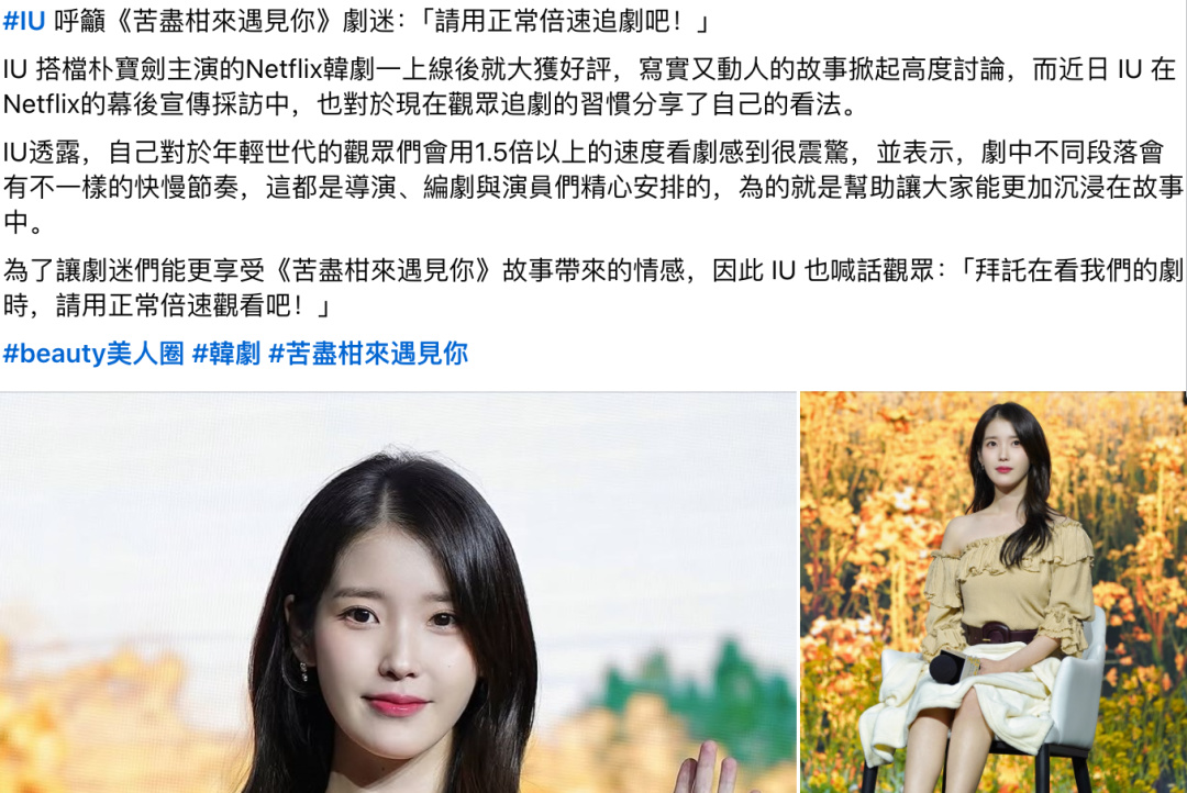 女主 IU 在接受採訪時,就拜託觀衆不要倍速看這部電視劇。因爲節奏快慢都是導演、編劇、演員們精心安排的,就爲了讓大家更能沉浸在裏面。