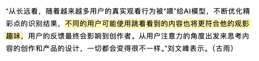 根據愛奇藝說法,“跳看”是基於 AI 的。隨着越來越多用戶的行爲被餵給 AI 模型,不同的用戶使用“跳看”看到的內容也不一樣。