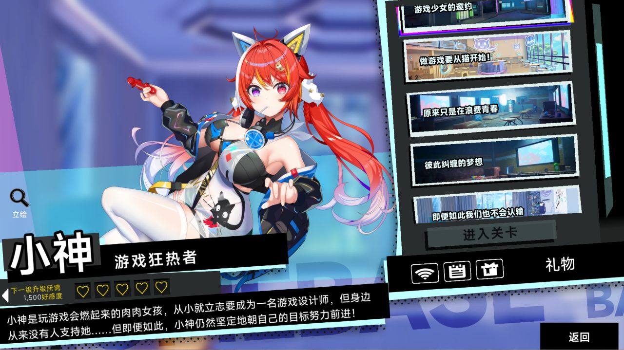 目前的三位角色中,小神喵擁有五段個人劇情(好感度最高的一位,妥妥的女一)
