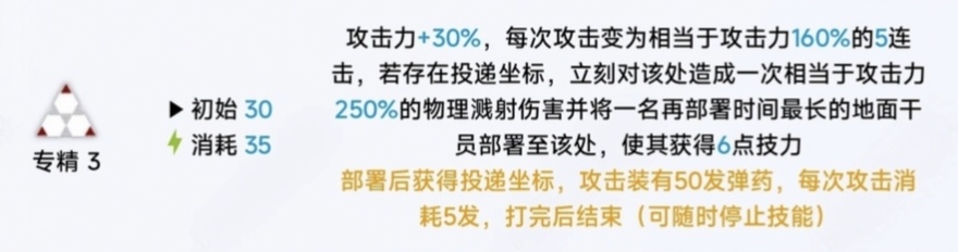 非常新穎的技能設計,投遞座標可以立刻再部署一個幹員(0費迴轉70s),那花樣就很多了,比如說官方前瞻演示裏的德克薩斯快速回費,速轉42二開黃昏爆殺蒸汽騎士,是真的強,42史詩級提升,來不及懷念模組了。該技能dph2000,總傷50發全打完外加轟炸濺射也同樣是15w左右,同樣非常強力的技能