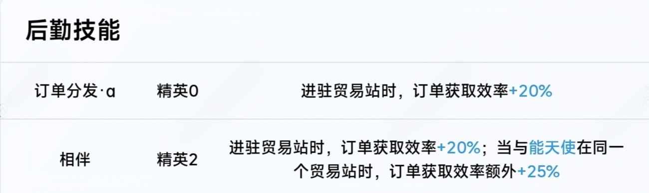 還是貿易站大戶,順便再附上蕾繆安的基建技能