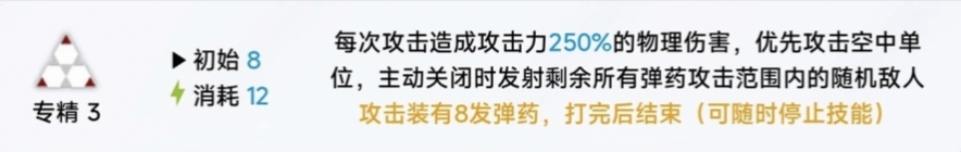 火力電臺:在場時,每當有友方幹員的彈藥被消耗就會回覆自身6%生命值,並有25%概率立即對該幹員攻擊範圍的敵人召喚一次轟炸,造成相當於自身攻擊力165%(+15%)的物理濺射傷害