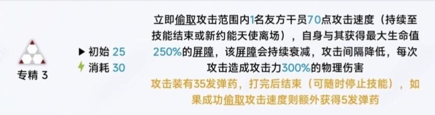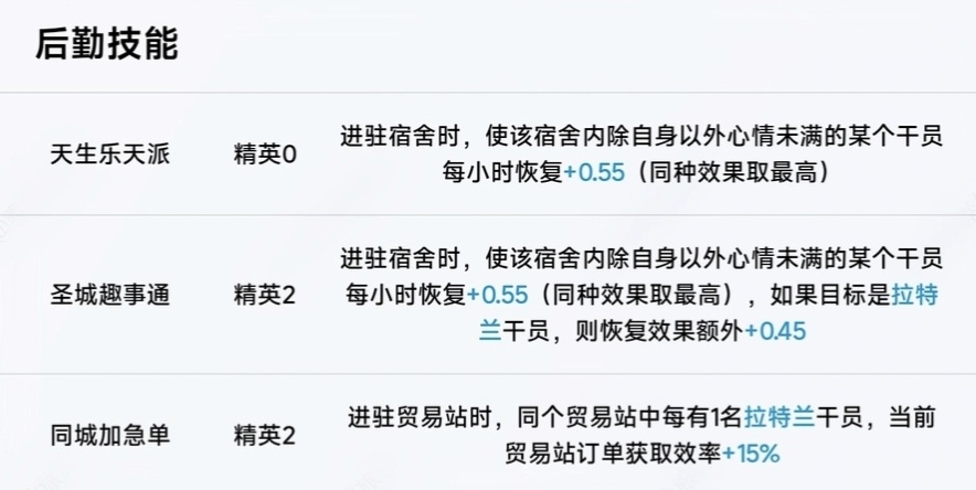銃彈協約:在場時,攜帶彈藥類技能的於員攻擊力+13%(+4%),對【拉特蘭】幹員的效果翻倍