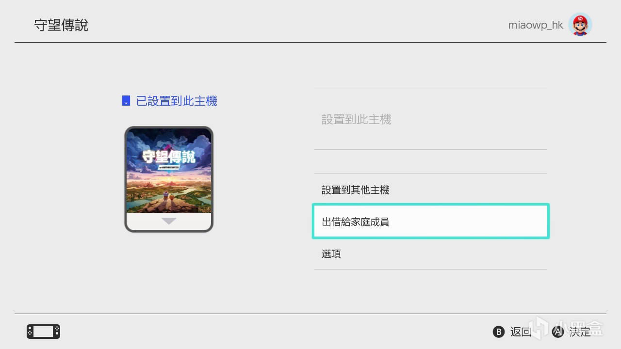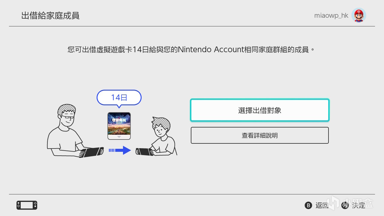 可以把已購買的數字版軟件借給屬於同一Nintendo Account家庭組的成員所持有的Nintendo Switch系列設備。