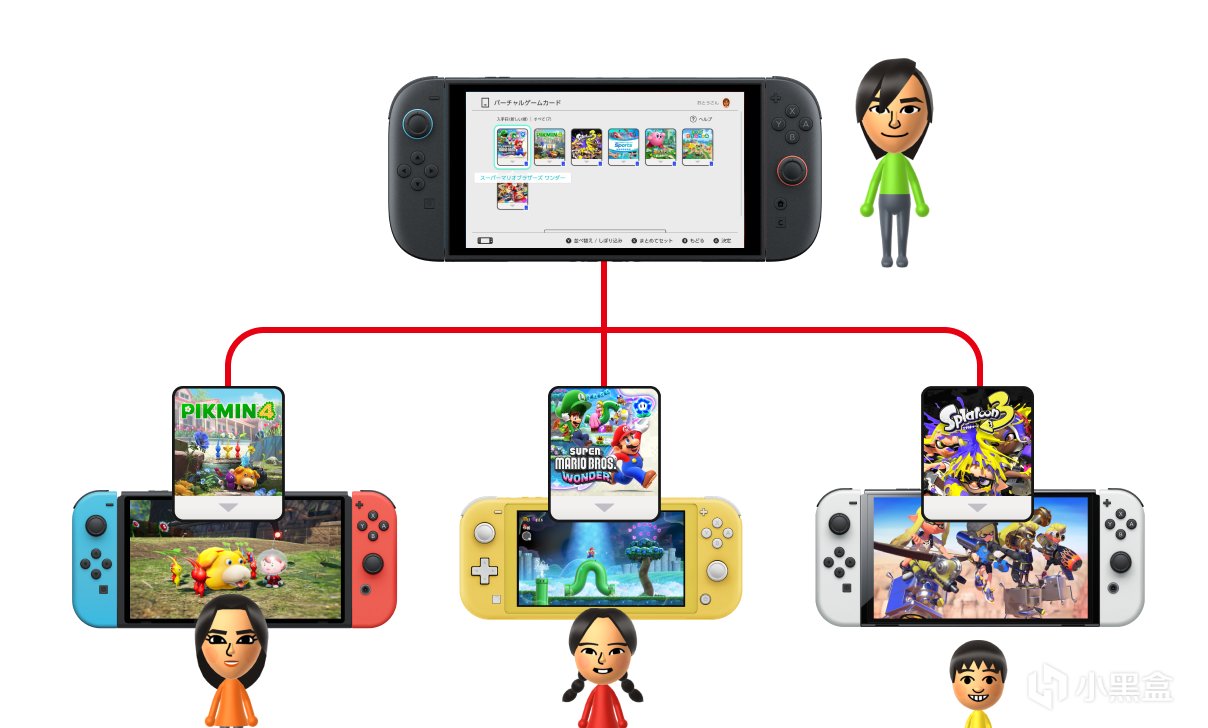 在兩臺主機登錄同一個任天堂賬號(Nintendo Account)後,只需在想要使用的主機上重新設置虛擬遊戲卡帶即可遊玩。設置完成後無需連接網絡即可運行遊戲,主機內創建的其他用戶也可遊玩。