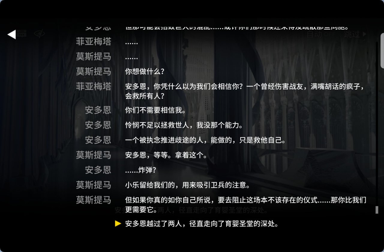 醒來的安多恩明白了自己被蠱惑了,就在馬上被綁架的時候,菲亞和小莫此時則是殺進了保育間救下安多恩,安多恩覺得自己還能做點什麼,就帶上了能天使留下的炸彈去給育兒園放了個大煙花,阻斷了賜予光環的儀式。而一直在天花板上蹲那個傳銷頭目牧首的能天使出現,在各路人馬的幫助下能天使終於得以直面boss。