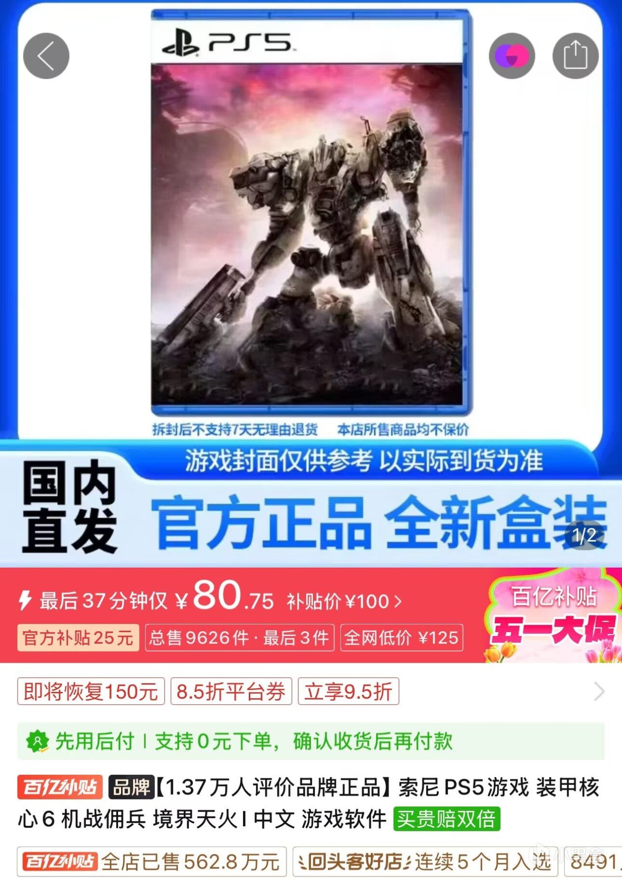 2.PS5遊戲《裝甲核心6》港版中文80.75元全新包郵,最近比史低價格稍微漲了幾塊錢,該作屬於機甲硬核動作遊戲,難度頗高,不建議新手小白入坑,當然你覺得100以下買個PS5實體版遊戲不虧可以隨便買。