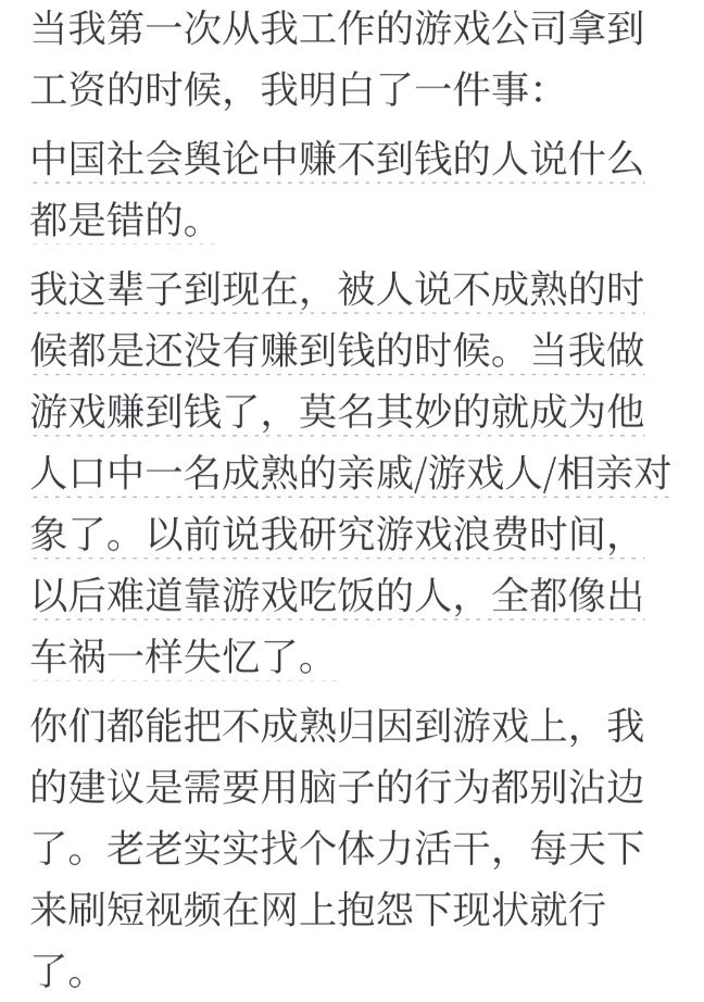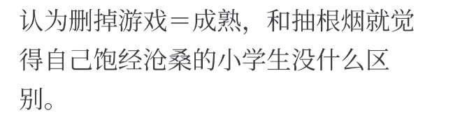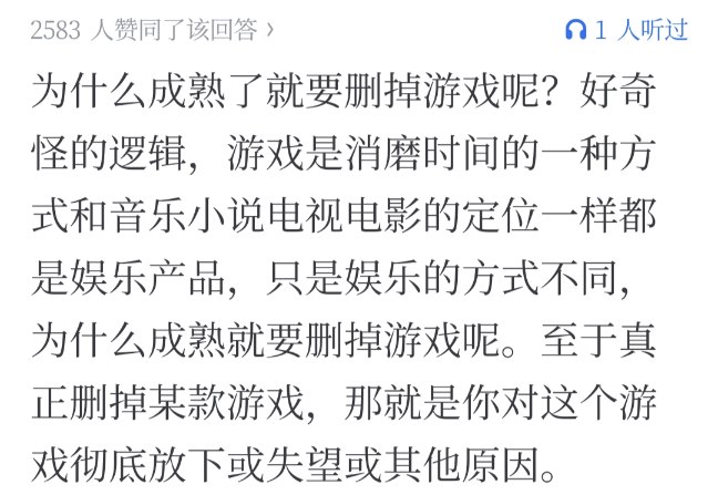 當然還有一部分表示反對,打遊戲時長跟你成熟成功沒有任何關係,即使你不打遊戲了,你也會有其他消磨時間的方式,而這些會更貴,因爲遊戲其實是日常生活中最省錢的消磨方式,看電影,健身等等方式都比打遊戲貴。還有人表示賺錢跟成熟掛鉤,你沒錢打遊戲叫做不成熟,你靠遊戲掙錢了,他們就失憶了等等……