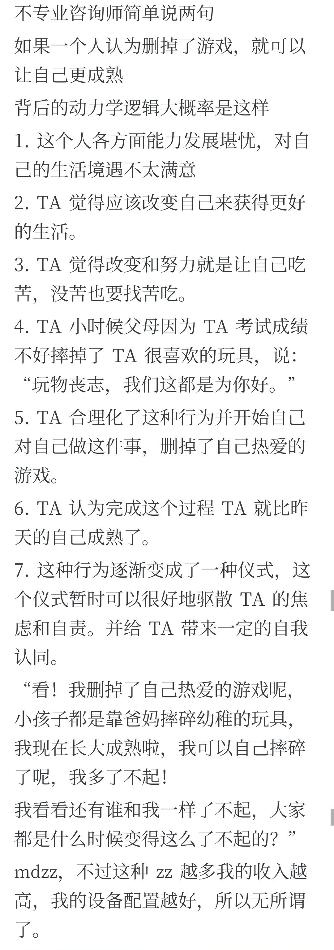 部分回答表示,真正“刪掉遊戲”的過程往往比想象中更艱難,類似戒癮,需要反覆多次才能徹底割捨;觸發這一行爲的契機多與進入職場、感情變化或學業壓力有關;雖然刪遊之初充滿痛苦,但最終能收穫更多可支配的時間與精力,用於自我提升、培養新興趣及享受生活,從而真正走向成熟。
