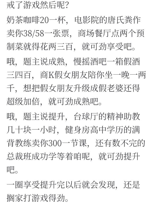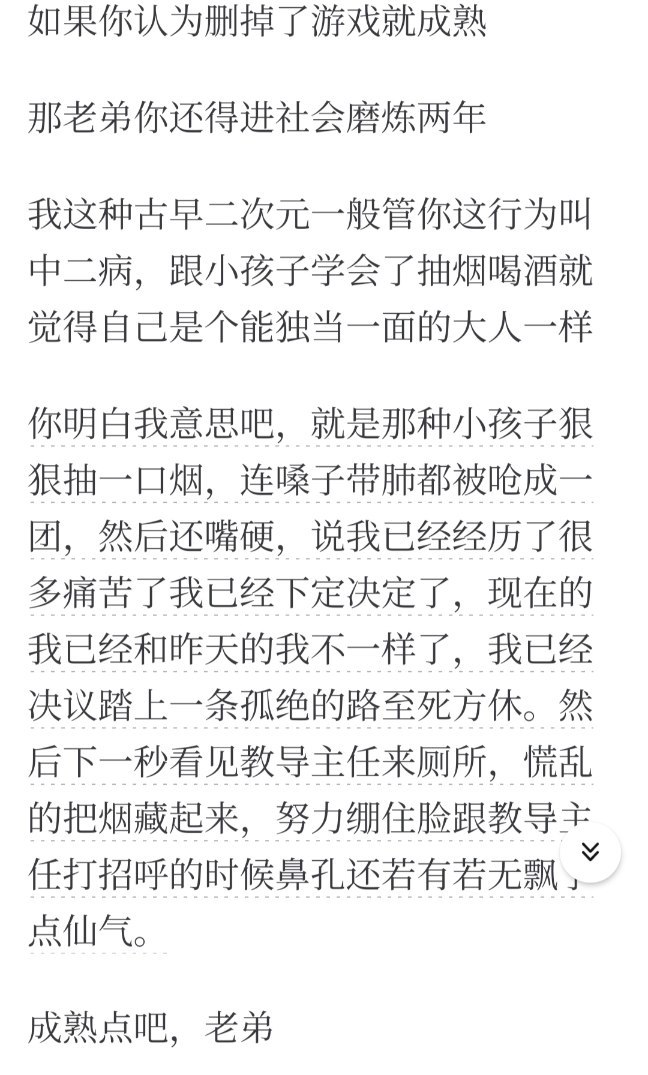 真正的成熟不在於永遠告別遊戲,而是建立起對娛樂的掌控感。就像普魯斯特在《追憶似水年華》中寫的:"真正的發現之旅不在於尋找新景觀,而在於擁有新眼光。也就是想玩就玩即使怎麼玩也不會沉迷進去。